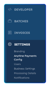 In the Merchant Portal, navigate to Settings > Anytime Payments Configuration to access