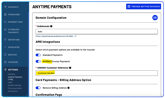 AndDone AMS360 Integration Anytime Payments Setup Options