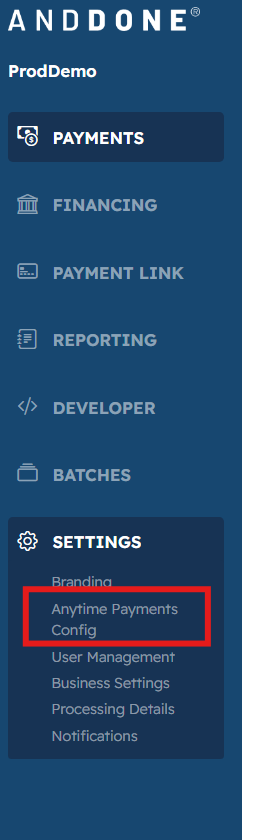 Click on Settings on the lower left-hand side of the menu to open the Settings drop-down menu and select Anytime Payment Config