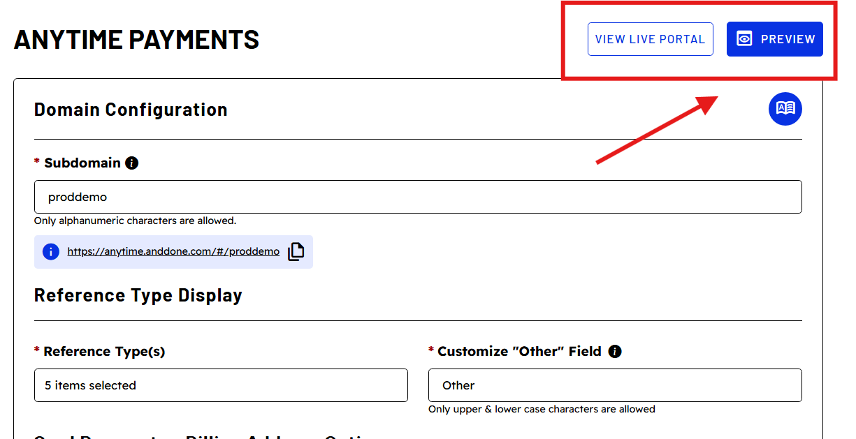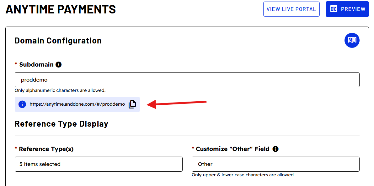 Within the Anytime Payments configuration window, you will see the hyper link under Domain Configuration and a Copy button.