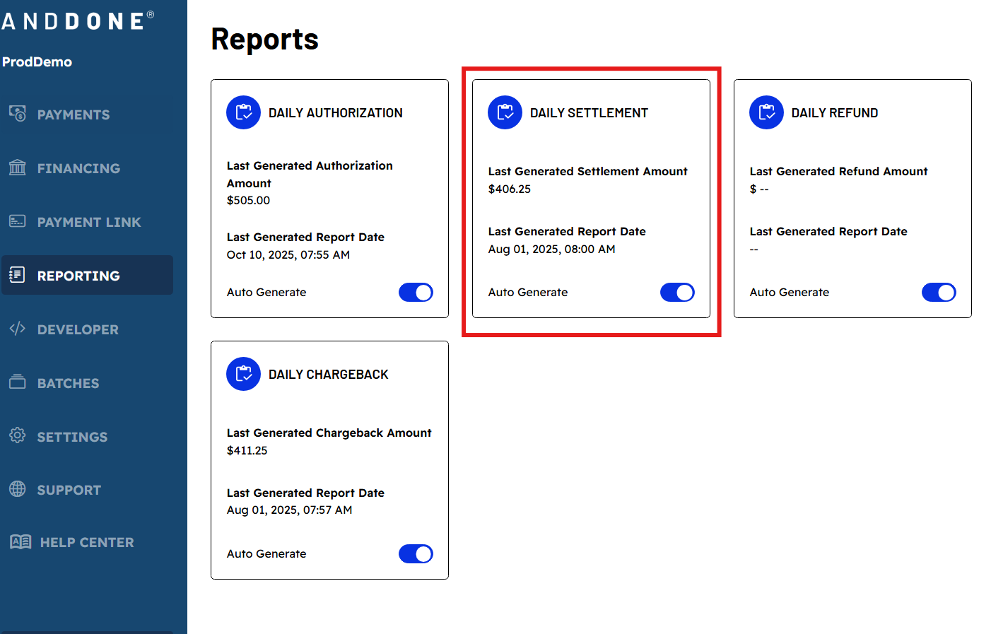 Accounting teams and bookkeepers tend to refer to the Daily Settlement Report to help reconcile ACH deposits from AndDone. The Daily settlement report contains an itemized list of transactions included in the batch deposit sent to your designated bank account.