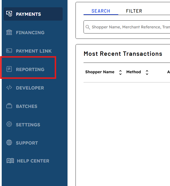 Click on Reporting located in the navigation bar on the left side of the portal.