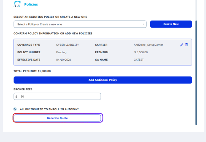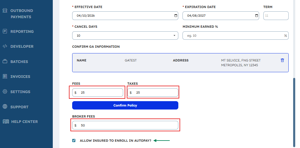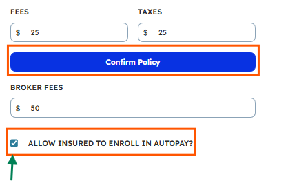 Allowing your insured to Enroll in Autopay will be automatically defaulted, you may uncheck this box if you do not want to offer autopay enrollment options to your insureds. However, we recommend always offering Autopay options to your insureds.