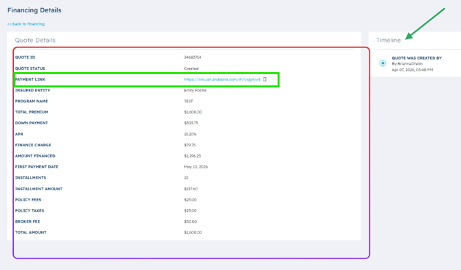 Click on your quote to review the details, recopy the Payment link (if needed), and refer to the Timeline.