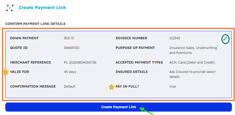 Notice the Edit pencil in the upper right hand corner. Common items to edit might be the adjusting how many days you want the payment link to be valid or Do you want to offer Pay in Full option- True/ False?