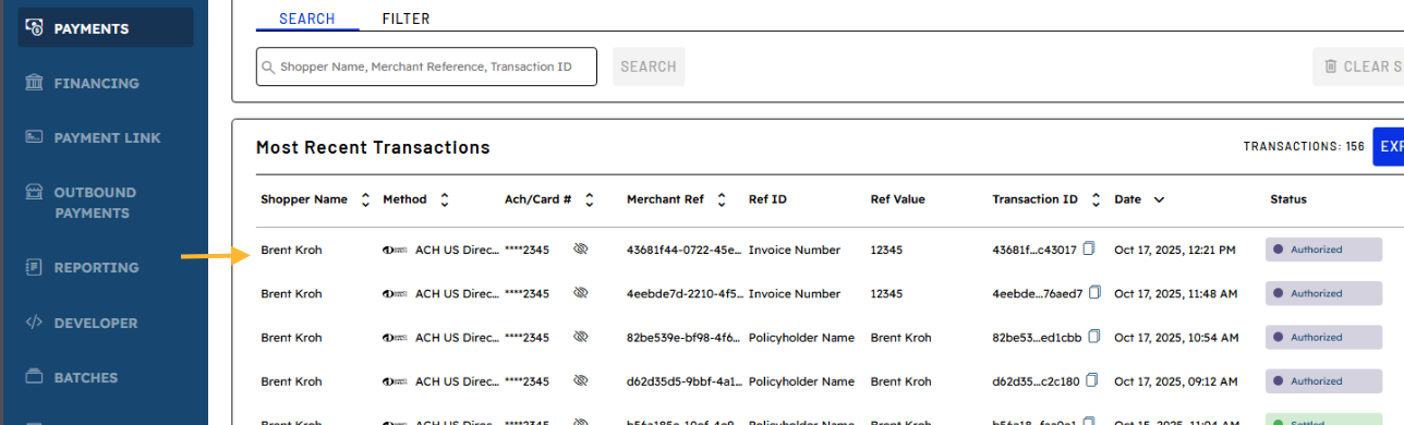 Upon login (click here to reach the login page), your payments dashboard is your default home screen displaying recent payments.