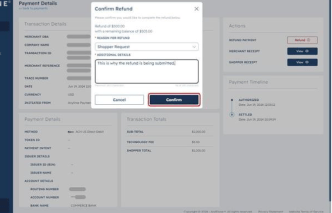 The status will update from “Refund Authorized” to “Refund Initiated” and then “Refund Settled” once the refund has been completed. See example timeline within the transaction:
