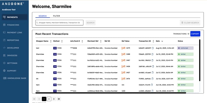 - Filter transactions by source type (AMS360, Anytime Payment, AndDone.js, Payment Link)