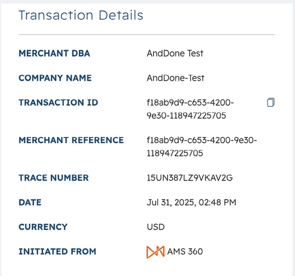 Transaction details show “Initiated from: AMS360” to indicate the source.